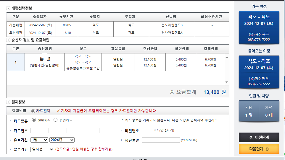 2024년 12월 주말 기준 식도행 배편의 요금입니다. 요금은 변동될 수 있으니 가보고 싶은 섬 홈페이지에서 확인하세요.