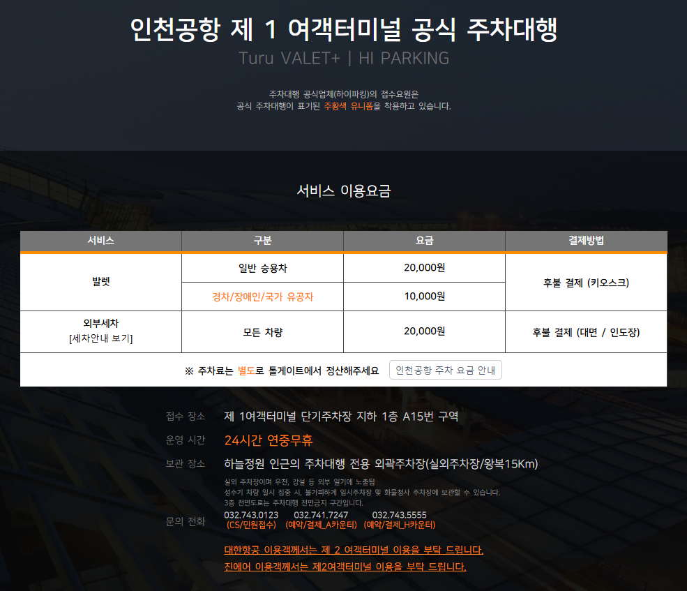 제1여객터미널의 공식 주차대행업체는 하이파킹입니다. 하이파킹은 공신력 있는 서비스로, 공항 내 공식 계약을 맺고 운영 중입니다. 하이파킹은 사전 예약을 통해 빠르고 안정적으로 차량을 인수받을 수 있어 성수기에도 대기 시간을 최소화할 수 있습니다. 하이파킹 예약은 공식 웹사이트에서 가능하며, 제1터미널에서 출국하는 분들께 적합한 서비스입니다.