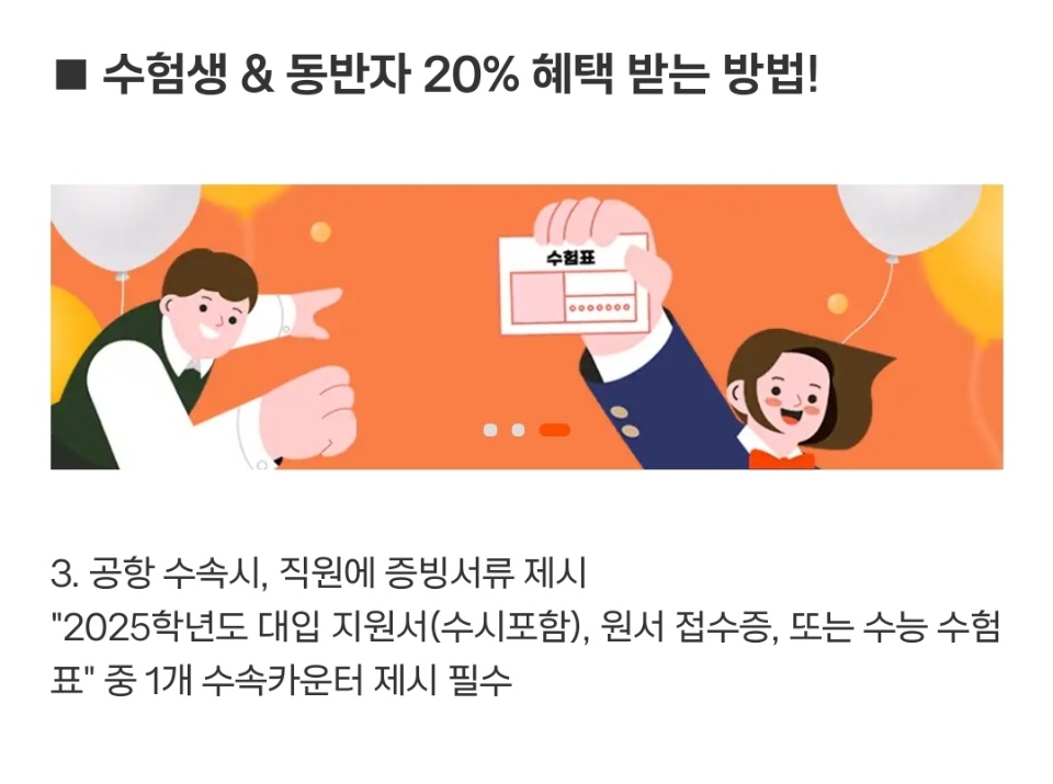 할인을 적용받기 위해서는 반드시 예약 시 ‘수험생 본인 및 동반자 할인’ 항목을 선택해야 하며, 공항에서 수험표, 접수증 등 수험생임을 증명할 수 있는 서류를 제시해야 합니다.