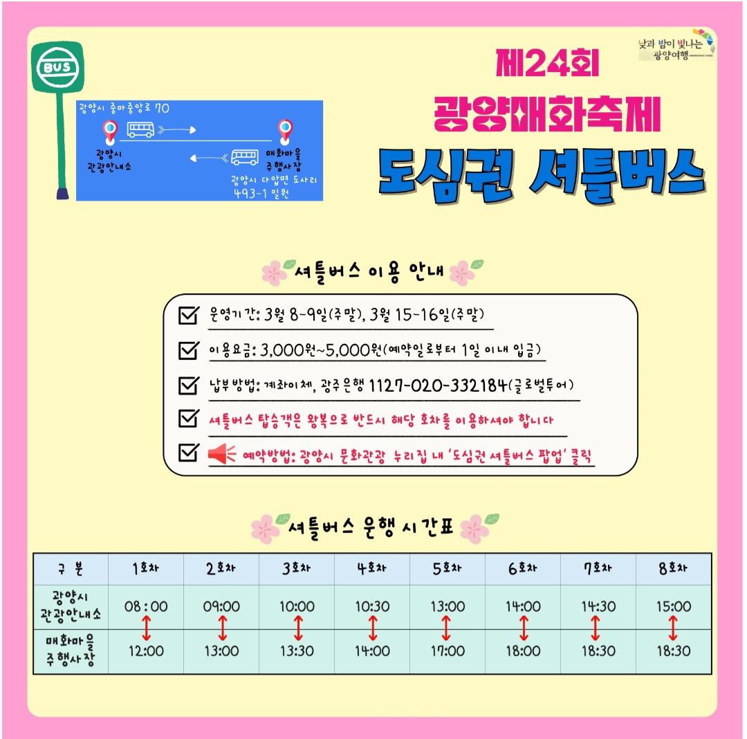 - 광양시관광안내소 ↔ 축제장 (유료, 예약)